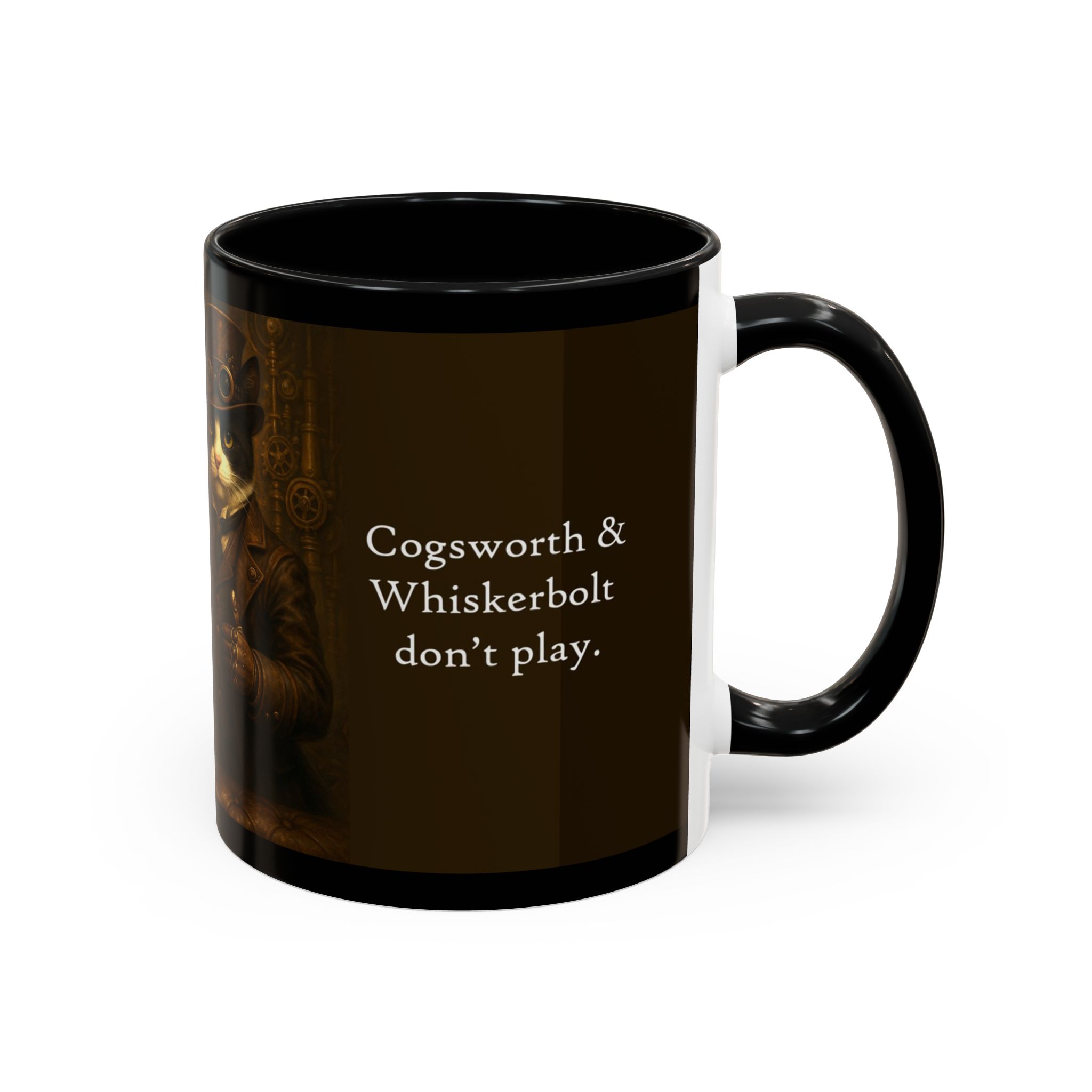 Start your day with a touch of adventure! This industrial inspired coffee mug showcases the charming duo, Professor Cogsworth & Captain Whiskerbolt. The caption reads, ‘One more cup of coffee and the fur starts fly’in. Cogsworth & Whiskerbolt don’t play.’ Perfect for coffee lovers who enjoy a dash of feline flair and mechanical marvels in their morning ritual.”