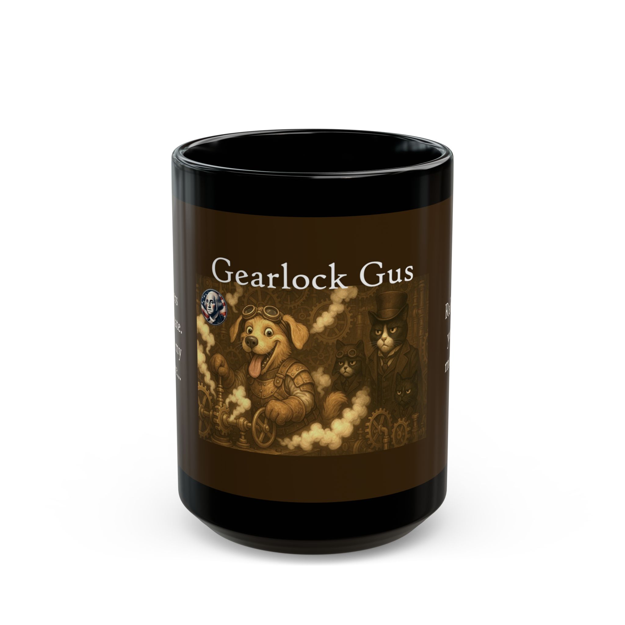 Set against a backdrop of interlocking brass cogs, polished pipes, and curling plumes of steam, this coffee cup brings to life the delightfully chaotic world of Gearlock Gus and his feline frenemies. At the center, Gearlock Gus, clad in leather gloves and oversized goggles, grips a massive valve wheel, sending pistons clanking and steam hissing through the workshop. With a toothy grin, he almost seems to call out, “Reboot your mood!” as he nudges his “friends” into action.